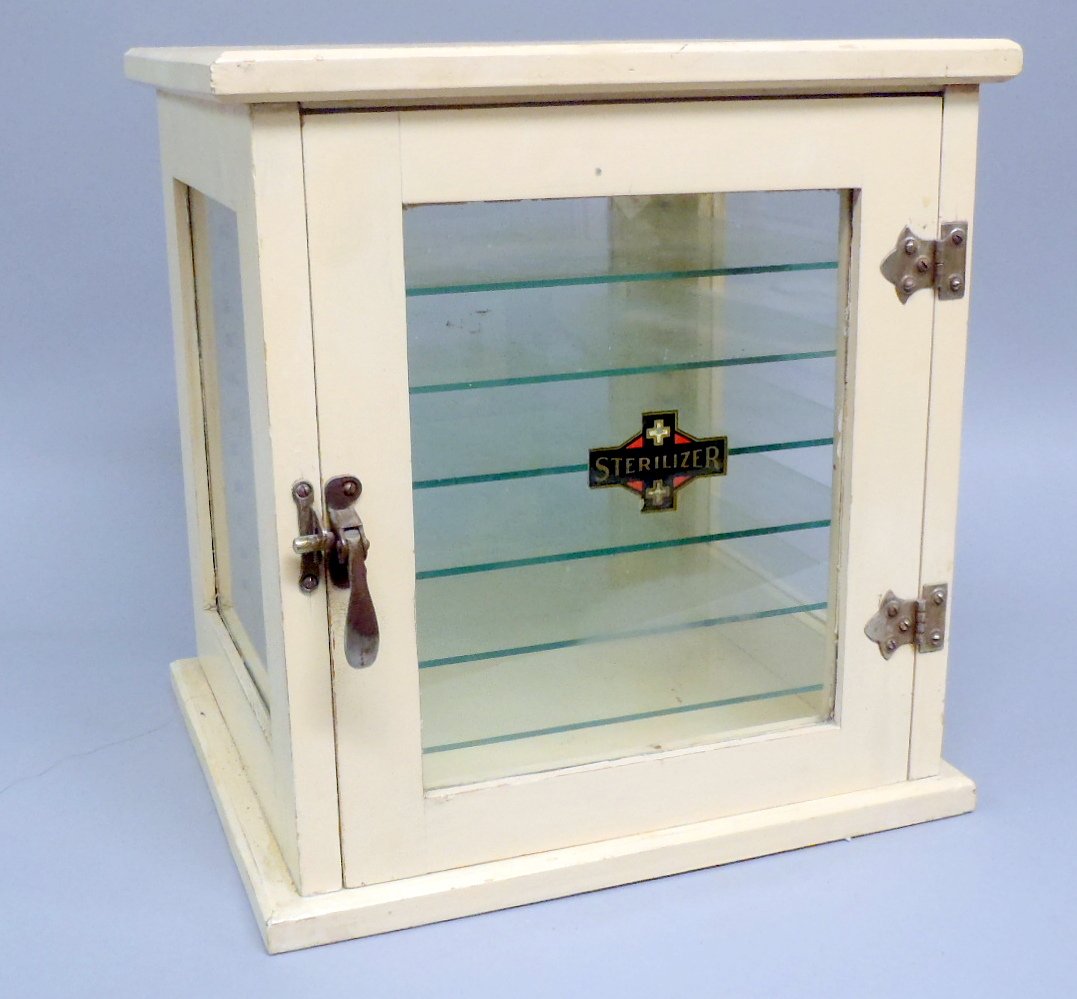 Vintage antiseptic medical barber sanitary sterilizer glass metal case cabinet.